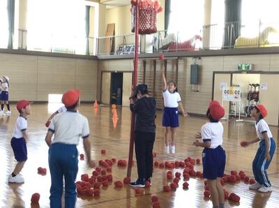 まずは、「玉入れ」です。紅組、白組ともに中央のかごに向かって一生懸命に玉を入れていました。