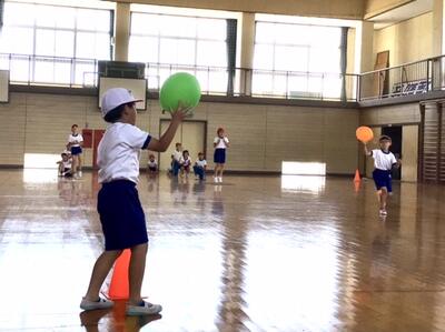 次に、「風船リレー」です。風船を空中に弾きながら、折り返しのコーンを回って風船を次の人に渡します。