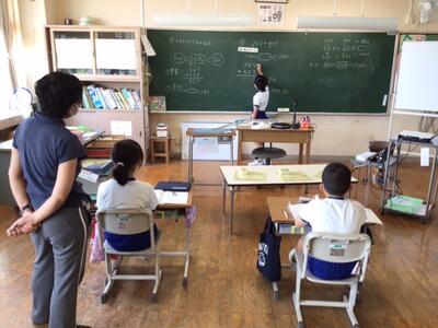代表の児童が黒板に導き方を書いて、他の児童から考え方や説明の仕方について意見をもらいます。