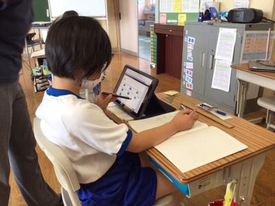 1年生はまだ、タブレットの使い方に慣れていないので、使い方も学びながらの学習です。