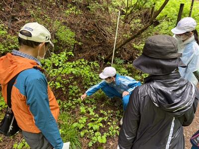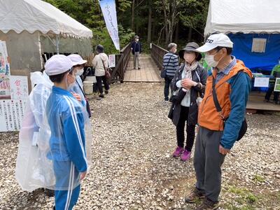 森の案内人の6年生は、斜面に咲き誇るクマガイソウについて、見学ポイントにくるお客さんにクマガイソウについて色々と丁寧に説明をしていました。