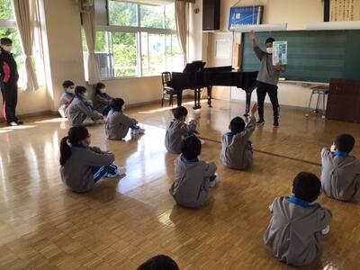 ゴールデンウィークの真っ只中ですが、5月の月初めなので全校集会を音楽室で行いました。