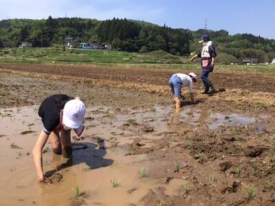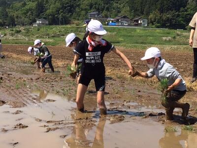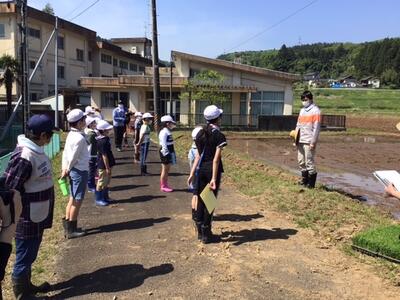 5月6日 ゴールデンウィーク真っ只中 水原小学校の実習田で「田植え」を行いました。