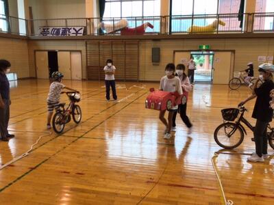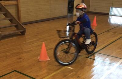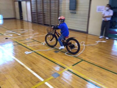 今回は、自転車の乗り方について実技訓練ですが、雨のため体育館で行いました。
