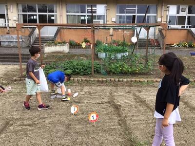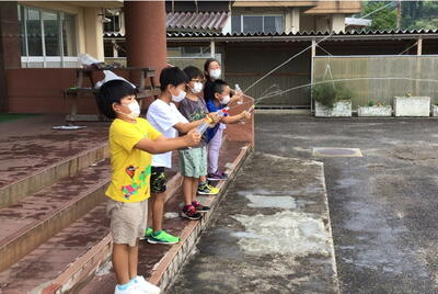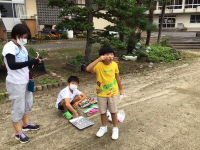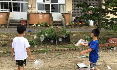 2022年7月19日 11時52分7月19日 1・2年生の生活科で水鉄砲とシャボン玉遊びをしました。