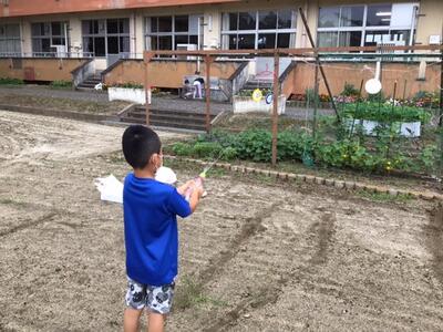 今度は、自分で作った水鉄砲の水が1番飛ぶのは誰かを競争しました。みんな、一生懸命に遠くまで飛ばす工夫をしていました。