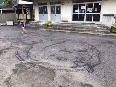最後に、水鉄砲で地面に絵を描いていました。お姉ちゃんの絵を着た1年生もいて、とても上手でした。たちまち、地面がキャンパスに変わりました。