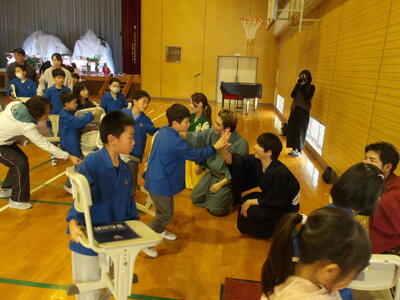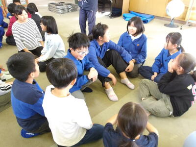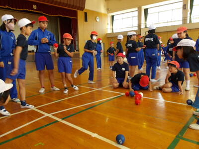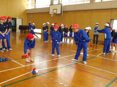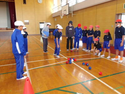 前半は、全校児童を8チームに分け、チーム対抗のボッチャを行いました。初めはぎこちなかった子どもたちも、何回か試合を繰り返すたびに、チームで作戦を考えたり、仲間にナイスプレーと声をかけたりと、自然にチームワークがよくなってきました。時間を忘れるくらい熱中していました。
