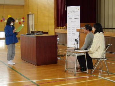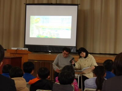 朗読の後、江藤さんやよしもとさんから感想を求められ、たくさんの子どもたちが自発的に手を挙げ、自分の思いを発表していました。特に、1年生からの発表が多く、感じたことを発表しようする勇気がすばらしいと思いました。