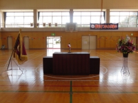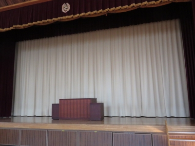 体育館の中幕の設置工事も3日で終わり,かかわっていただいた前PTA会長さんに確認をしていただきました。