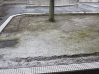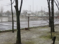 左から 防雪棚と吾妻中 常設の展示物 つくしが顔を出し