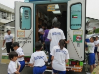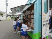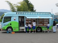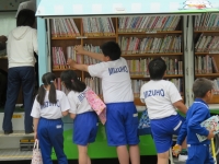 今日から1年生が本を借りられるので,担任の先生に引率され,1年生は心うきうきでしのぶ号のところに行きました。