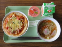 3月 8日 ピザ,ワンタンスープ゚,りんごゼリー