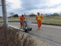 学校前の信号から学校脇を通ってフルーツラインまでの路側帯がライン引きが終了しました。