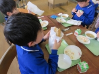1年生は,まだ慣れていないようで苦労して食べていました。