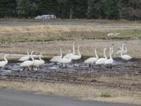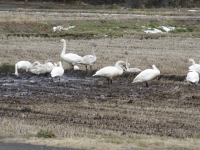 白鳥が群れていたところにいってみたところ,いましたいました。十数羽の白鳥が羽を休めて,田んぼの水を飲んだり,何かをついばんでいました。