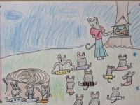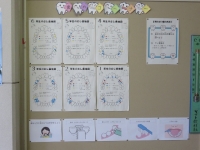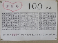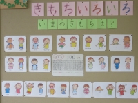 「きもちいろいろ:いまのきもちは?」の表題で,子どもたちのこころの状態をイラスト入りで表してあります。きもち100マスの表もあり,子どもたちは通る度に,どれかなぁと指で探しています。