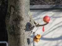 今は,主にヒヨドリなどのやや大きめの鳥が食べていますが,突っついて落ちたりんごをスズメなどの小さい鳥がこぞってついばんでいます。