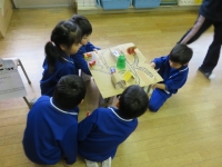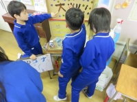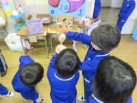磁石を使ったつりや割り箸でっぽうでの的当て,風力自動車など,2年生は1年生にやり方を上手に教えていました。1年生は目を輝かせていろいろな遊びをすることができました。