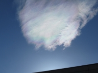 2日(水)15時頃,下学年の集団下校時に珍しい「彩雲(さいうん)」が現れました。太陽の近くを通りかかった雲が、虹色に彩られる現象で,雲に含まれる 水滴や氷粒に太陽光が反射する事で虹色に輝いて見えるそうです。3日(木)にも太陽のまわりにできた雲が虹色に輝いていました。