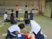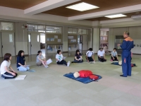 模型を使って心臓マッサージやAEDの使用方法などについて体験学習をしました。