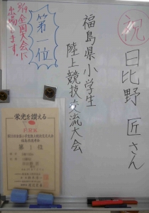 7/9(日)に全国小学生陸上競技交流大会の県大会が行われました。真夏日の中、本校の11名の選手たちは日頃の練習の成果を存分に発揮することができました。その結果、本校の児童が5年男子100m走において一位(全国大会出場)の成績を収めることができました。保護者の皆さまには、多数の応援と選手のサポートをしていただきありがとうございました。8/17(金)、8/18(土)に行われる全国大会も頑張ってきます!