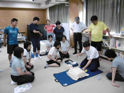 教職員の救急法講習を行いました。前PTA会長の浅野さん(赤十字救急法指導員)をインストラクターとしてお招きし、AEDの操作方法や人工呼吸のやり方などについて指導していただきました。参加した教職員は浅野さんの話を聞き、真剣に取り組んでいました。浅野さんお忙しいところありがとうございました。