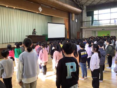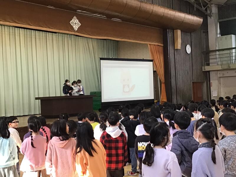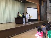 校長講話と表彰伝達の後に、6年生の総合的な学習の時間「マスコット作成チーム」による報告がありました。時間通りにテキパキと、全校生で校歌も歌いました。