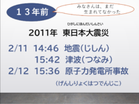 13年前の東日本大震災について、「3・11未来へつなぐ集会~東日本大震災 13年~」をオンラインで行いました。校長講話として、「地震」「津波」「原子力発電所事故」が起きたことなど、プロジェクター資料を使って、話がありました。子供たちのほとんどが生まれていないときの出来事ですが「福島県民の一人として、どうしていくか」を考えました。「知ること」そして、何よりも「生きる」ことが大事と、確認しました。