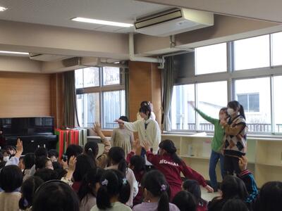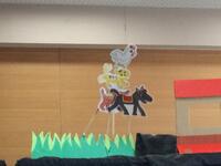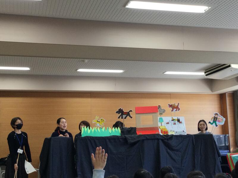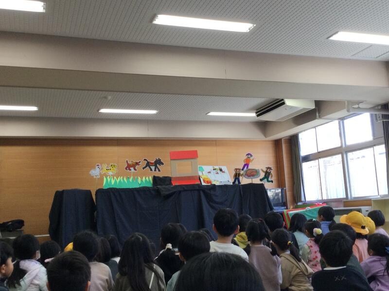 多目的ホールで、図書ボランティアの皆さんによるペープサート「ブレーメンの音楽隊」が行われました。ふくよみの日のスペシャルメニューです。歌あり、笑いありと楽しい時間でした。図書ボランティアの皆さん、ありがとうございました。この日のために、たくさん練習してくださいました。