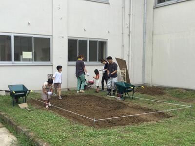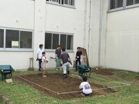 生活科や図画工作科のまなびのために、中庭に、もう一つの砂場を作ります。「みんなの森合小メンバー」の募集で、集まっていただいたみなさんで、作業しました。二日間にわたり、暑い中ありがとうございました。