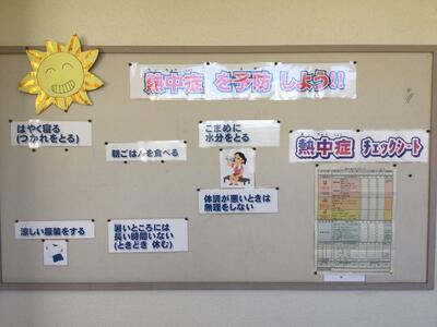 保健室の前には、熱中症についての掲示。保健委員会からは、昼の放送で、熱中症予防について呼びかけました。