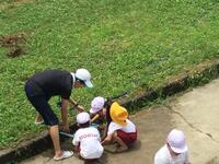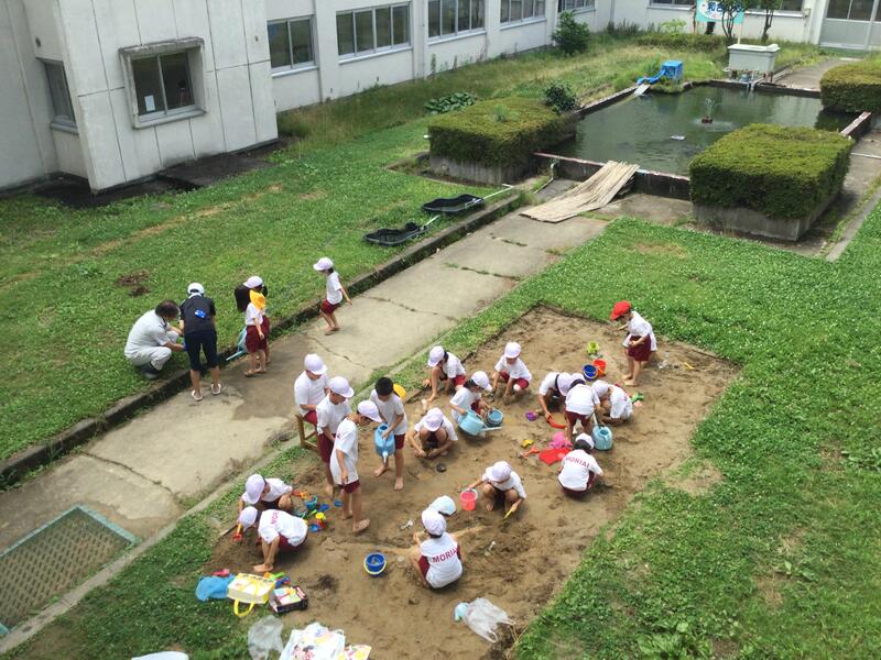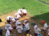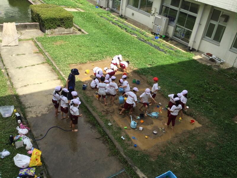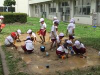 一年生が、中庭の砂場で、砂遊びをしました。図画工作科の時間です。
