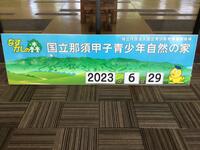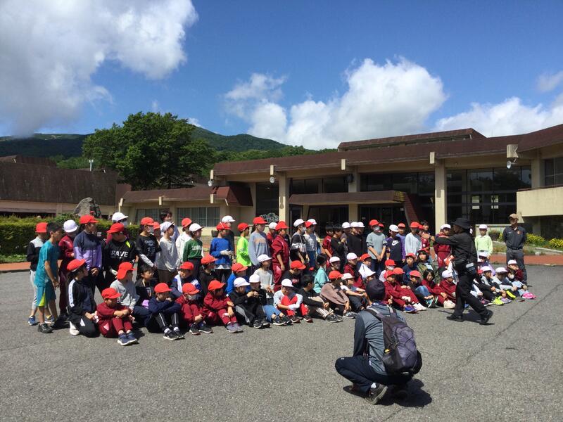 最終日。那須甲子青少年自然の家の前で、全員での記念撮影。青空です。
