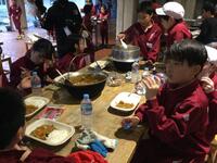 カレーが出来あがりました。かまどで炊いたご飯は、ピカピカでとても上手でした。カレーは、水加減が上手でした。