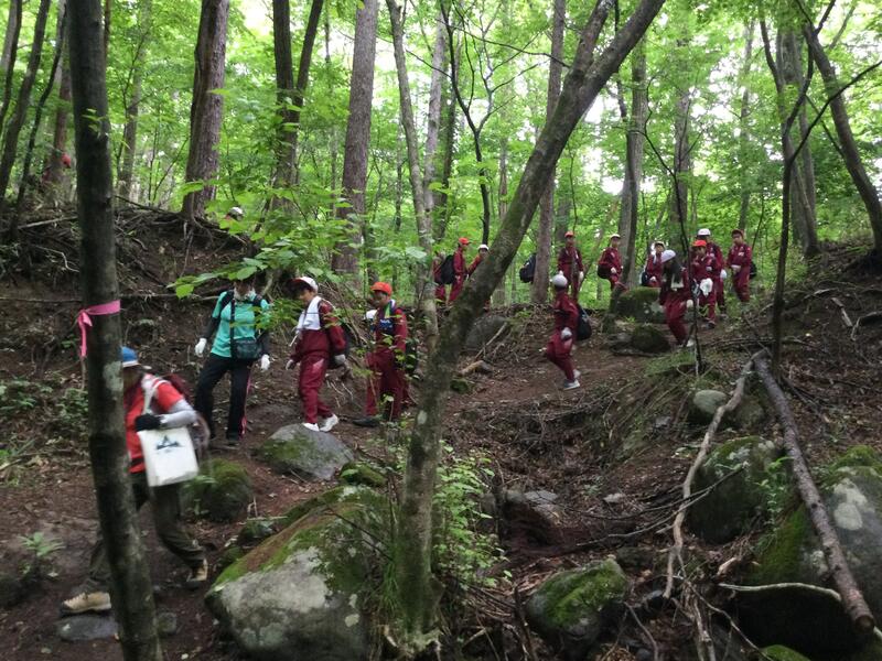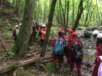 沢下りトレッキングです。森の案内人さんに、ところどころ説明していただいています。