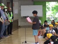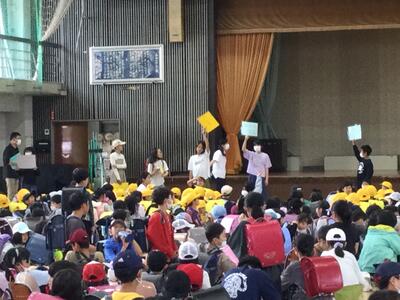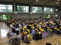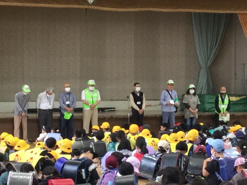 2023年5月29日 19時10分今日は、日頃、お世話になっている見守り隊の皆様との顔合わせが行なわれました。昨年度までは、オンラインでしたが、今年度は、体育館に全校生が集まって、実際に、見守り隊の皆様に会うことができました。お一人お一人から、自己紹介をしていただいた後に、六年生の代表が、日頃の御礼を伝えました。緊急時に、いつでも集団で帰れるように、全校生が六年生をリーダーとしてコース別に集まることもできました。