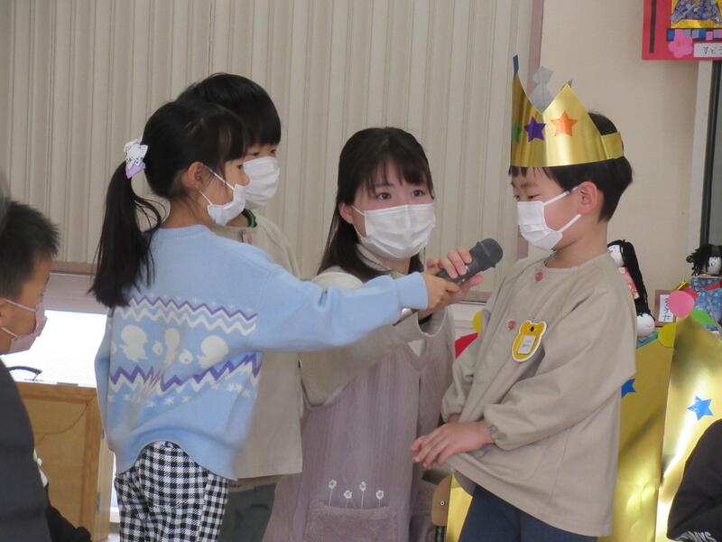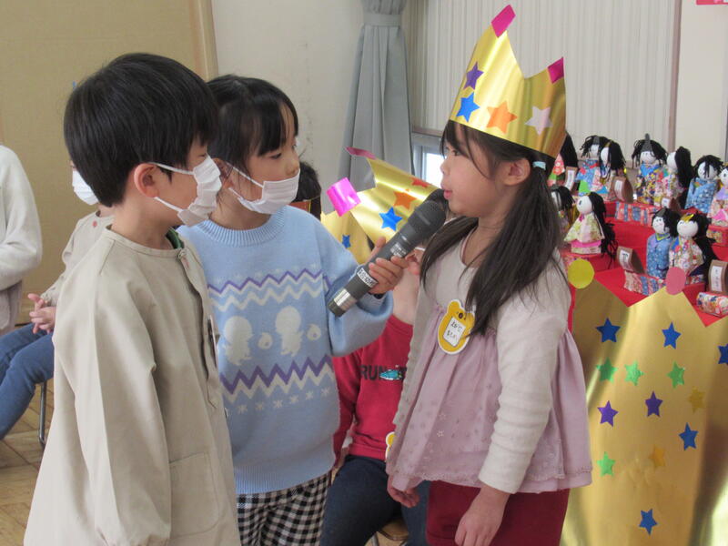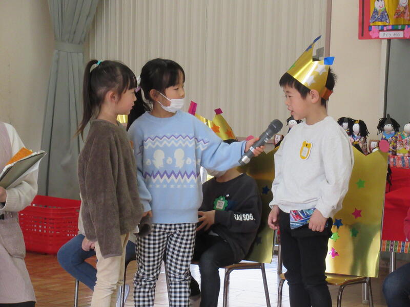 ひまわり組のお兄さんとお姉さんがちゅうりっぷ組のお友達にやり方を教えながらインタビュー。お誕生日のお友達も質問にきちんと答えることができました。