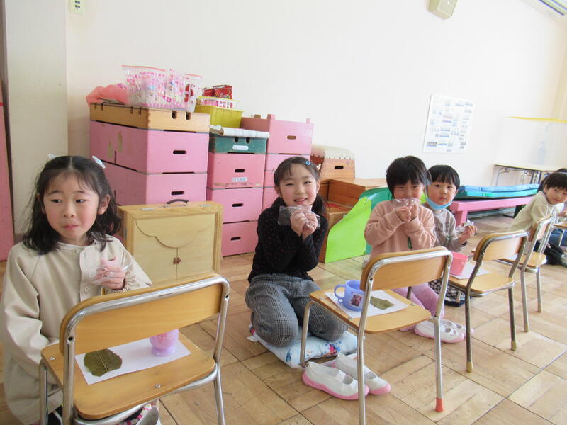 今回の行事のおやつは、桜餅とカルピスでした。おいしくて、思わずにっこり。