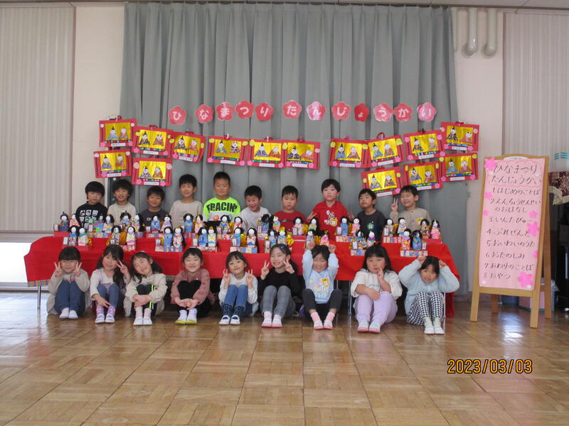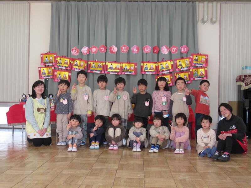 みんなが作ったひな人形のところで、集合写真。