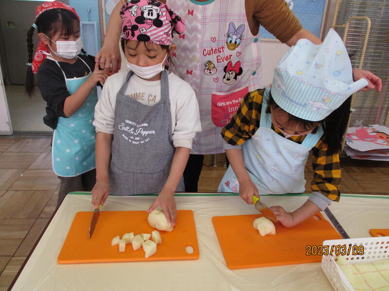 はじめに「お別れ会」で食べるカレーの調理です。ひまわり組さんは、カレーに入れる野菜を調理しました。