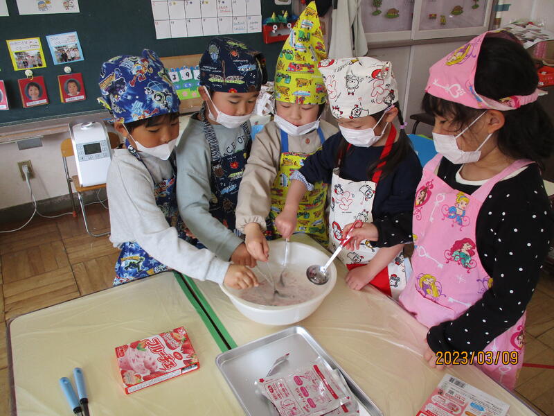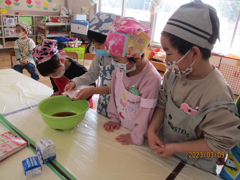 ちゅうりっぷ組さんは、デザートのフルーチェを作りました。「おいしそう!早く食べたいね。」