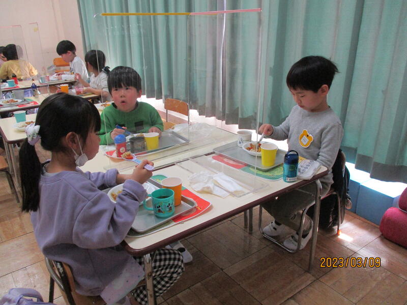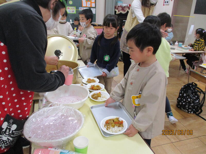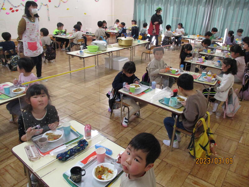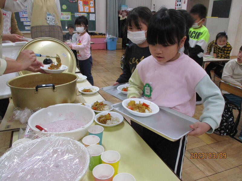 みんなで力を合わせて調理したカレーライスで会食です。ごはんには、ひまわり組さんが作ったお米がたくさん入っています。フルーチェもおいしそう。