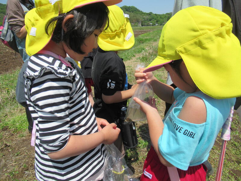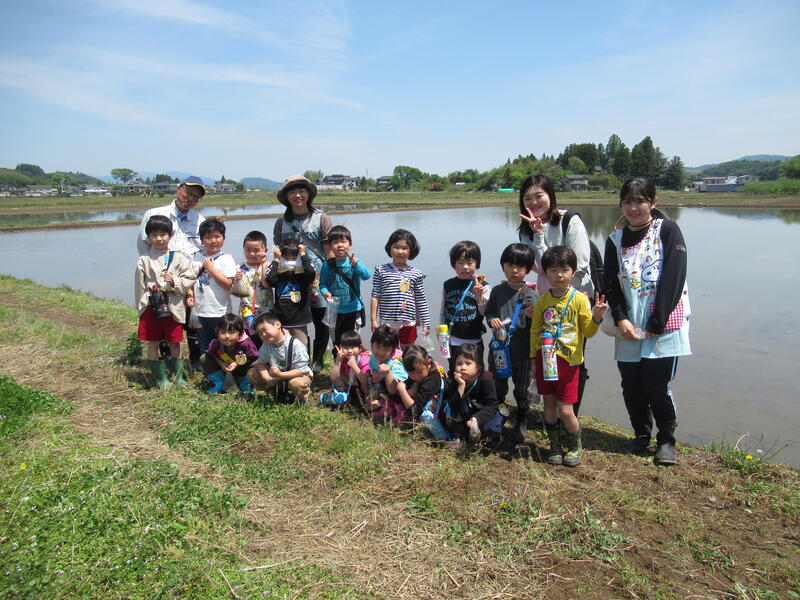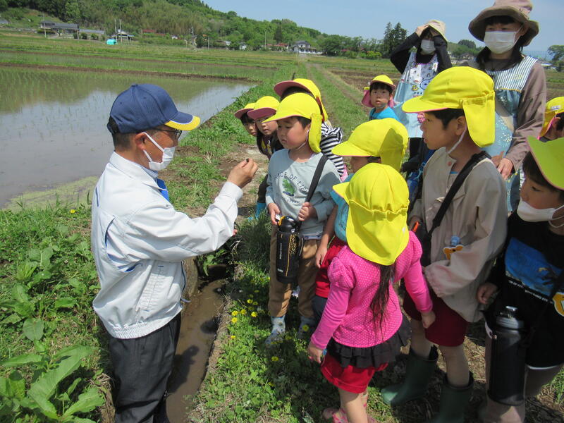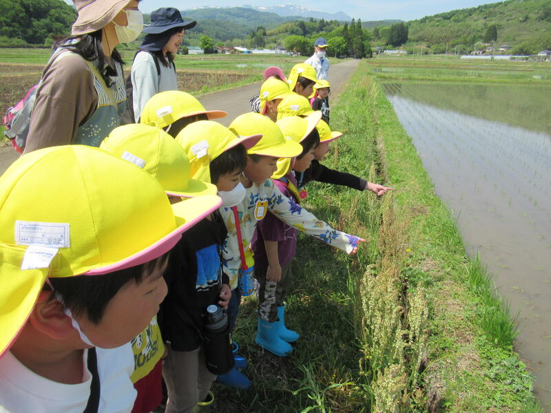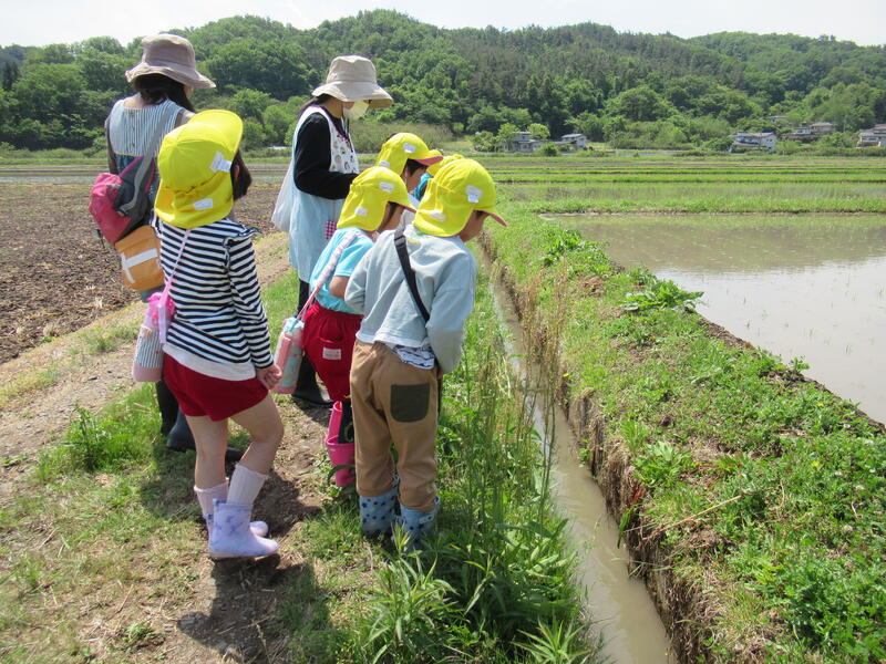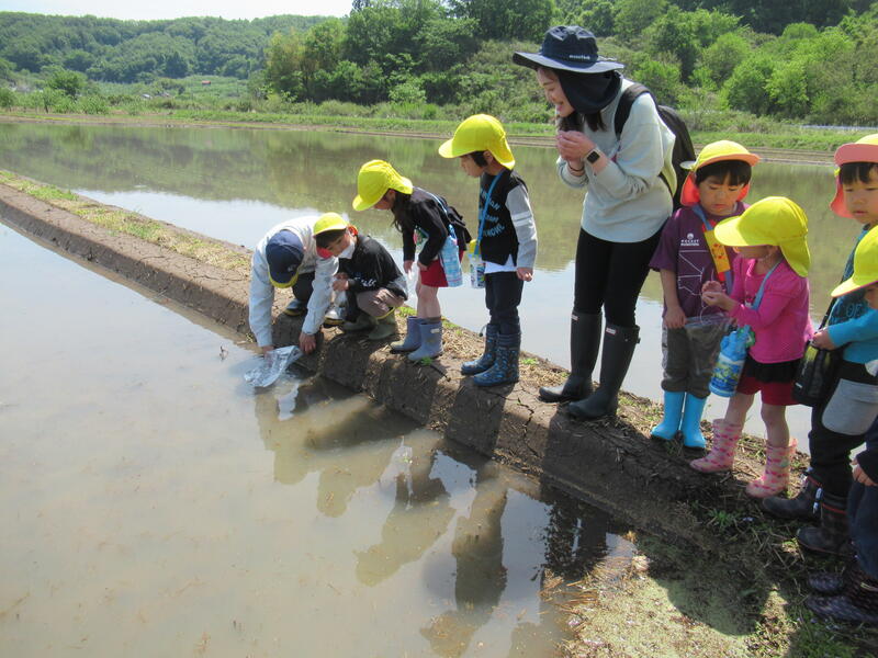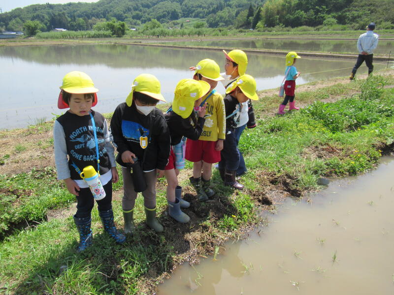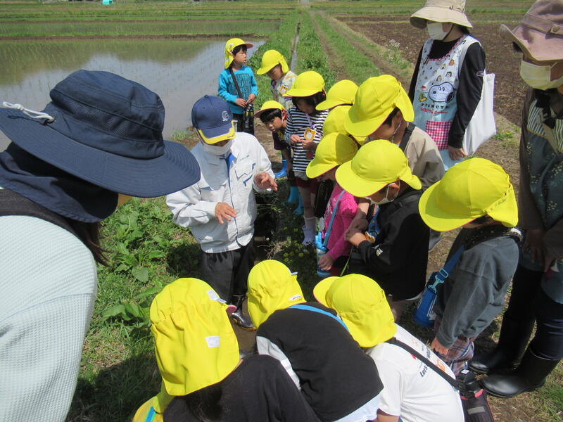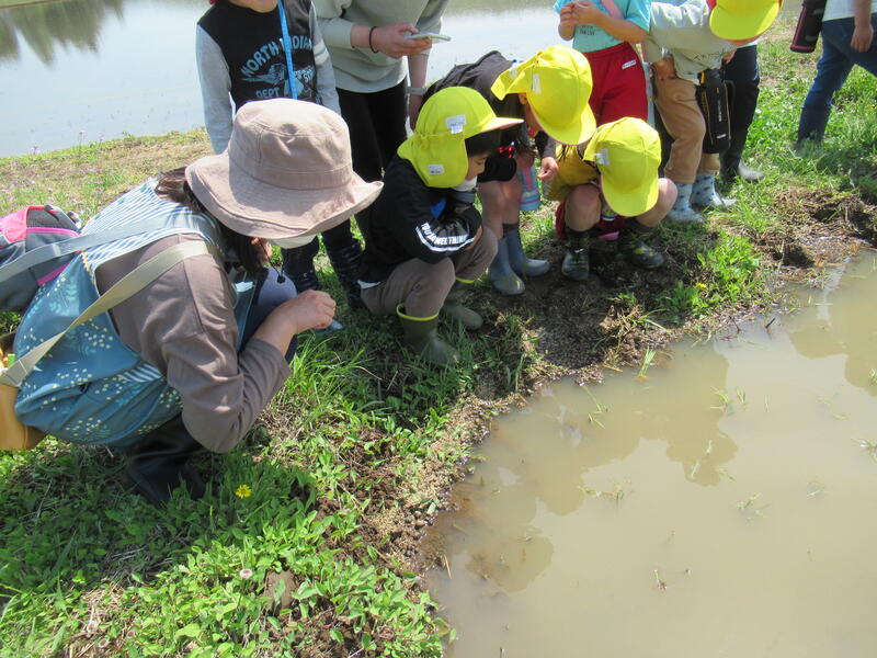 「本物の田んぼって、広い!」「カエルが鳴いているよ。」「タニシもいる!」「あっ、アメンボがいた!」