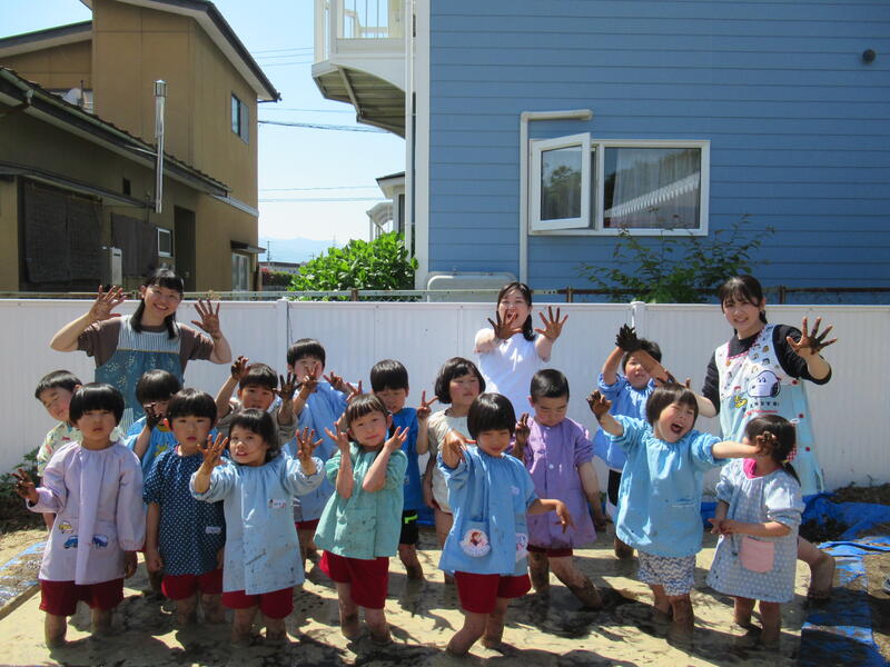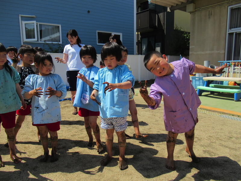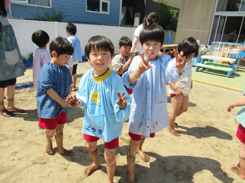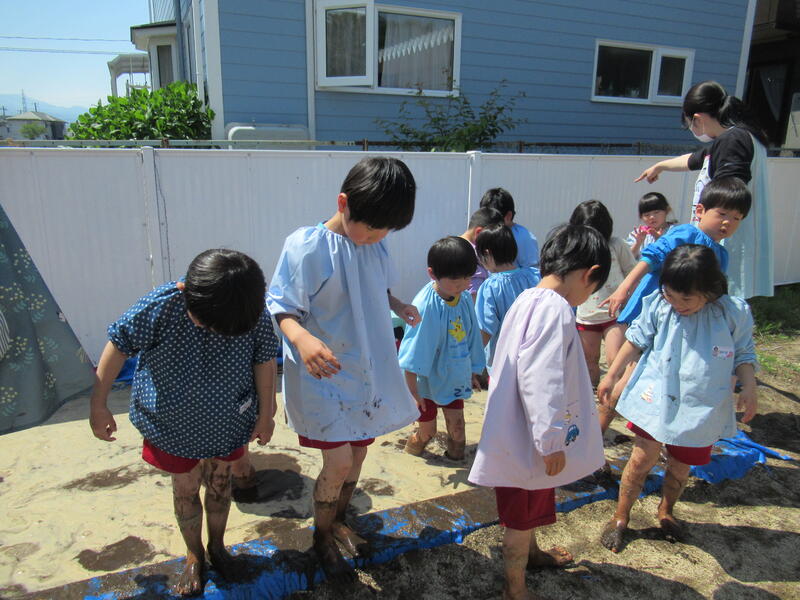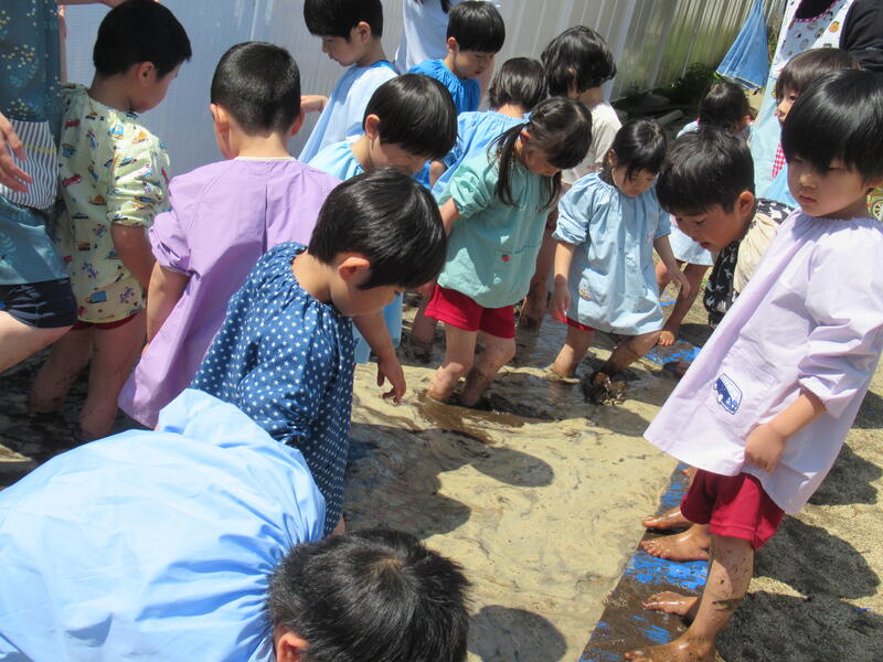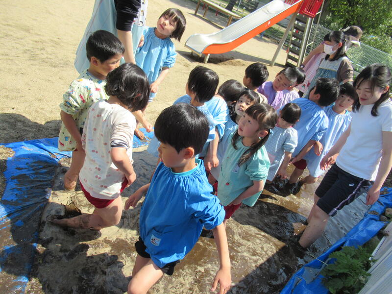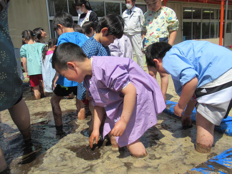 さあ、今度は、幼稚園に帰って田んぼのしろかきです。泥んこになりながら、みんなでしろかきをしました。