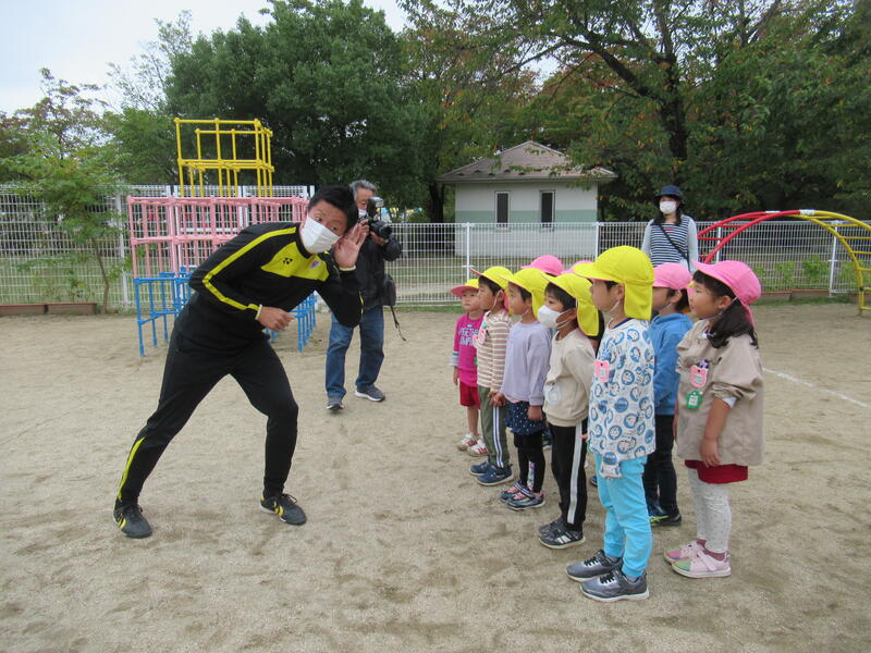 なべちゃんコーチがちゅうりっぷ組のみんなに何かを聞いています
