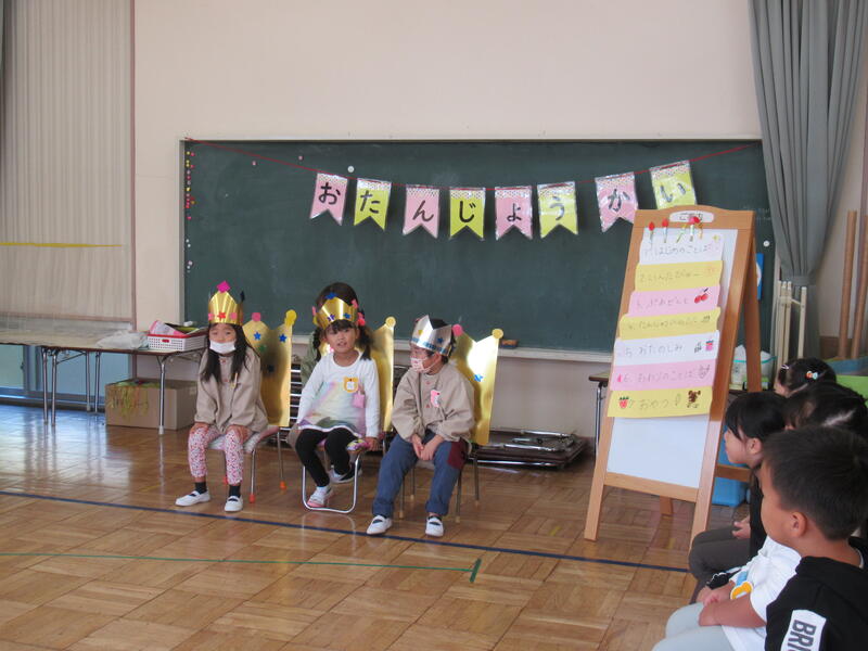 10月生まれのおともだちの誕生会を行いました。お誕生日のお友だち、ニコニコみんな嬉しそう。