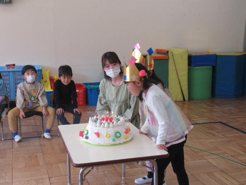 年長さんもお誕生ケーキのろうそくを上手に消せました。またまた、みんなから「おめでとう!」