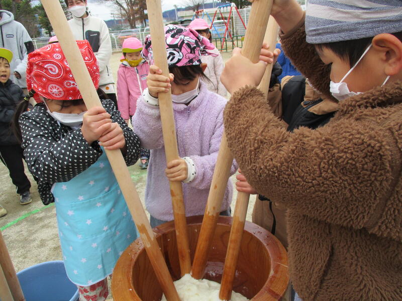 子どもたちも、千本杵でお餅つき。「おいしいお餅になあ~れ。」