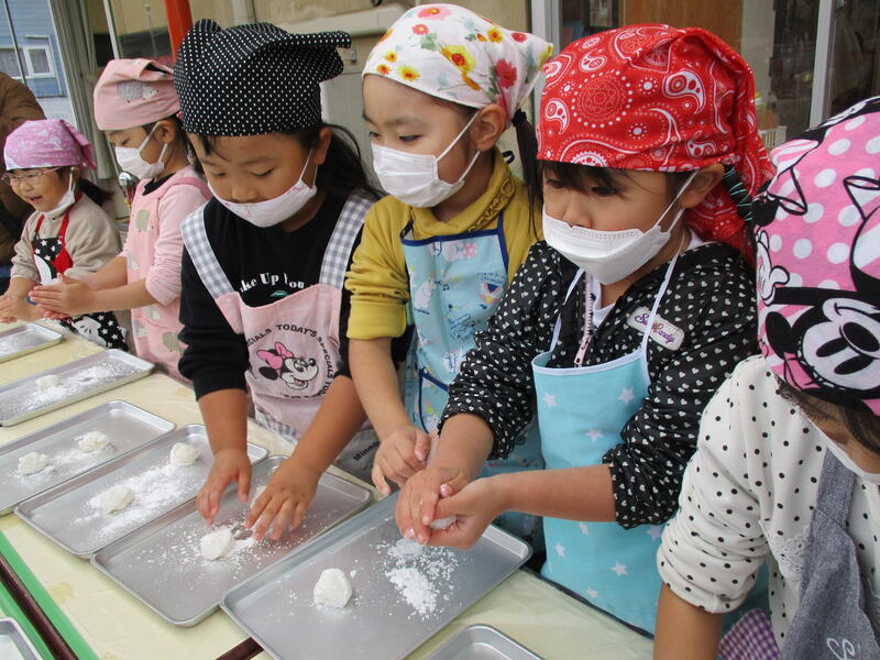 ちいさな可愛い手で、ついたお餅を丸めました。
